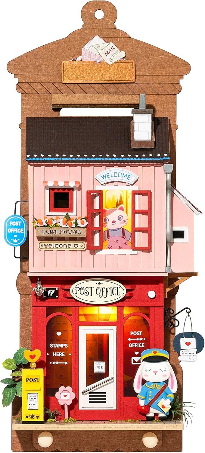 DIY Miniature Wall Hanging Kit – Love Post Office 3D Model Wooden House Building Display Decor Room with Key Hanger and LED Lights Dollhouse Puzzle for Teens and Adults DS021