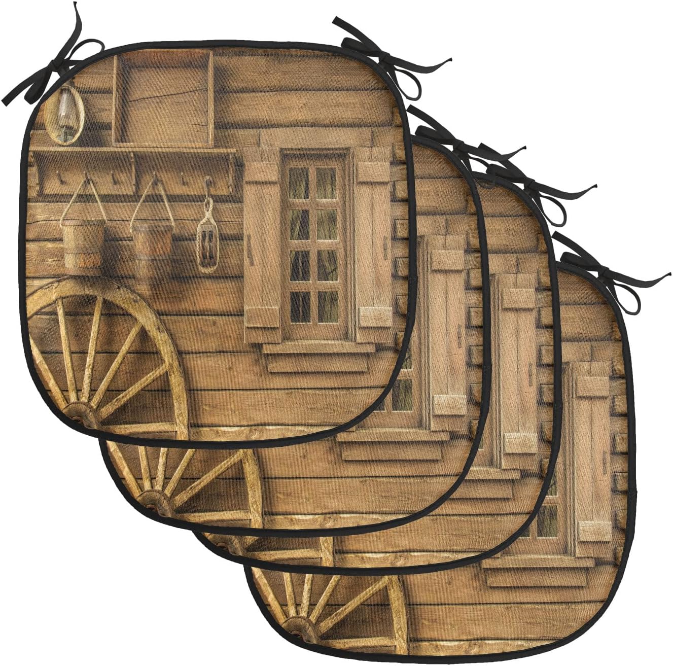 Western Chair Cushion Pads Set of 4, Old Wagon Wheel Next to Rustic Wooden House Vintage Window Buckets Cottage Print, Seat Padding for Office with Anti-Slip Backing, 16’x16′, Brown